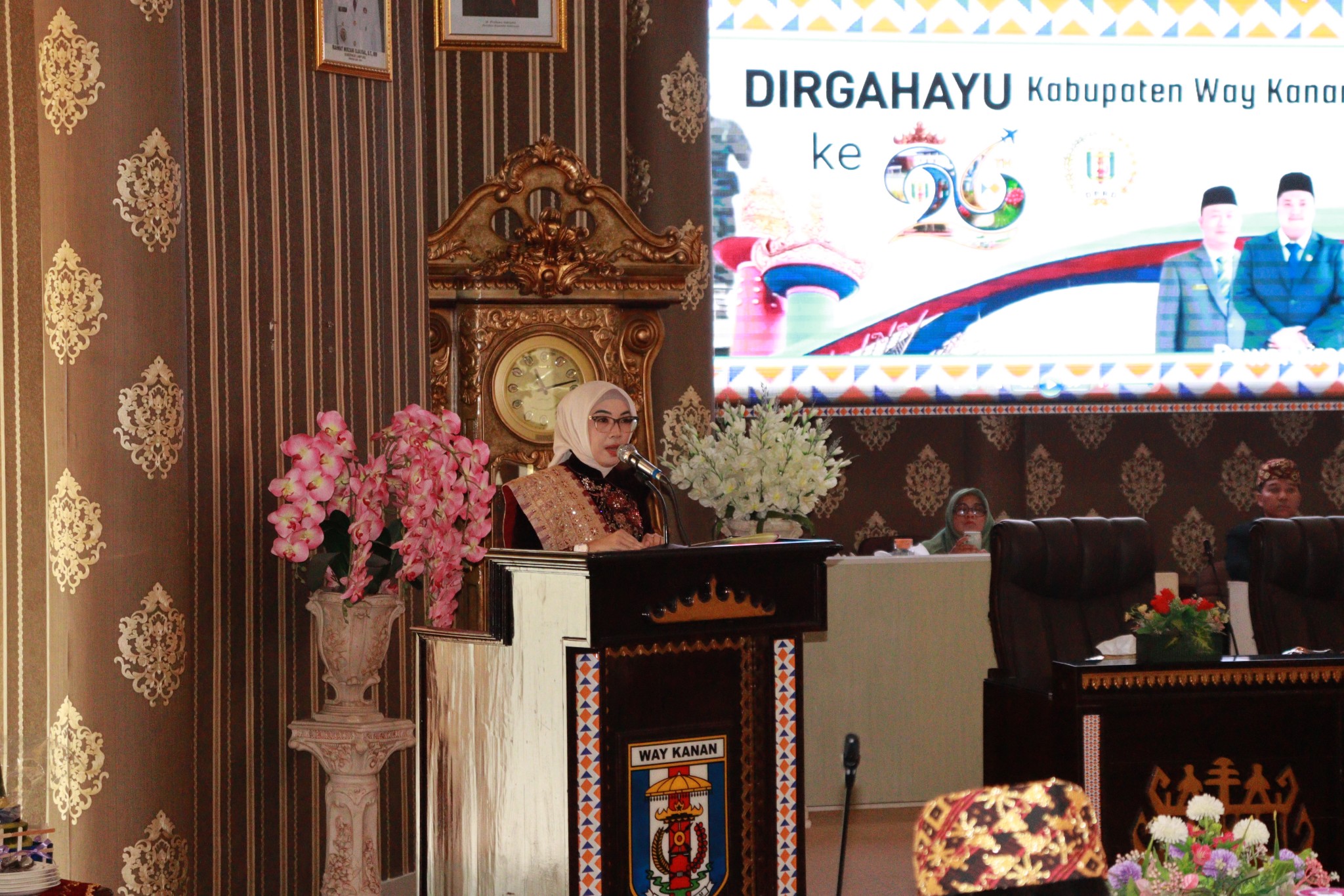 “Diusia ke 26 ini, kondisi perekonomian, tata kelola pemerintahan, pembangunan sumber daya manusia, dan kondisi lingkungan hidup terus membaik. 26 tahun bukanlah waktu yang singkat. Dalam kurun waktu tersebut, Kabupaten Way Kanan telah mengalami berbagai dinamika pembangunan, menghadapi tantangan, dan meraih berbagai kemajuan. Semua ini tidak lepas dari kerja keras, dedikasi, serta sinergi yang terjalin antara Pemerintah Daerah, DPRD, dan seluruh elemen masyarakat Kabupaten Way Kanan”, ujar Plt. Bupati Ayu Asalasiyah.