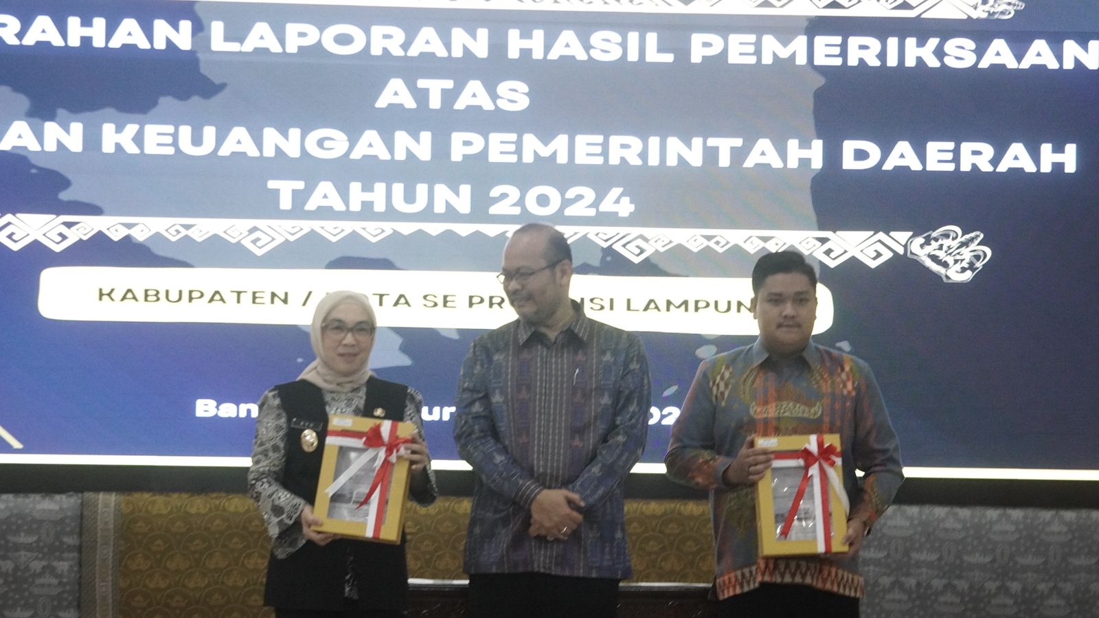 Kepala BPK Perwakilan Provinsi Lampung, Nugroho Heru Wibowo secara langsung menyerahkan LHP kepada Plt. Bupati Ayu Asalasiyah, didampingi Ketua DPRD Kabupaten Way Kanan, Rial Kalbadi.