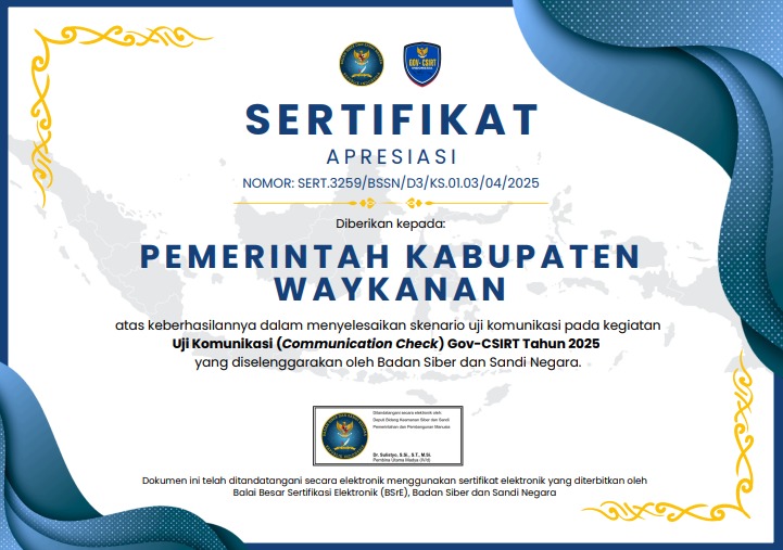 Bupati Way Kanan, Ayu Asalasiyah, S.Ked., melalui Kepala Dinas Komunikasi dan Informatika, Yusron Lutfi, S.H.,M.M yang diwakili oleh Kepala Bidang Statistik dan Persandian, Ir. M. Azmi Masruri, S.T.,M.T., menerima Sertifikat Apresiasi dengan Nomor : SERT.3259/BSSN/03/KS.01.03/04/2025. Penghargaan ini menunjukkan komitmen dan kesiapan Pemerintah Kabupaten Way Kanan dalam mendukung kebijakan nasional terkait keamanan ssiber, khususnya dalam pengelolaan dan penanggulangan insiden keamanan informasi di sektor Pemerintah Daerah.